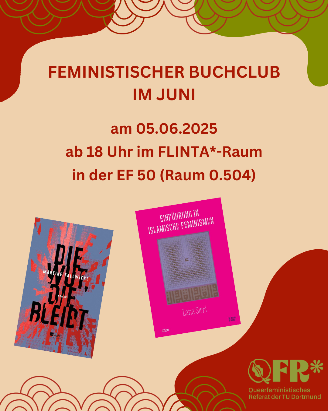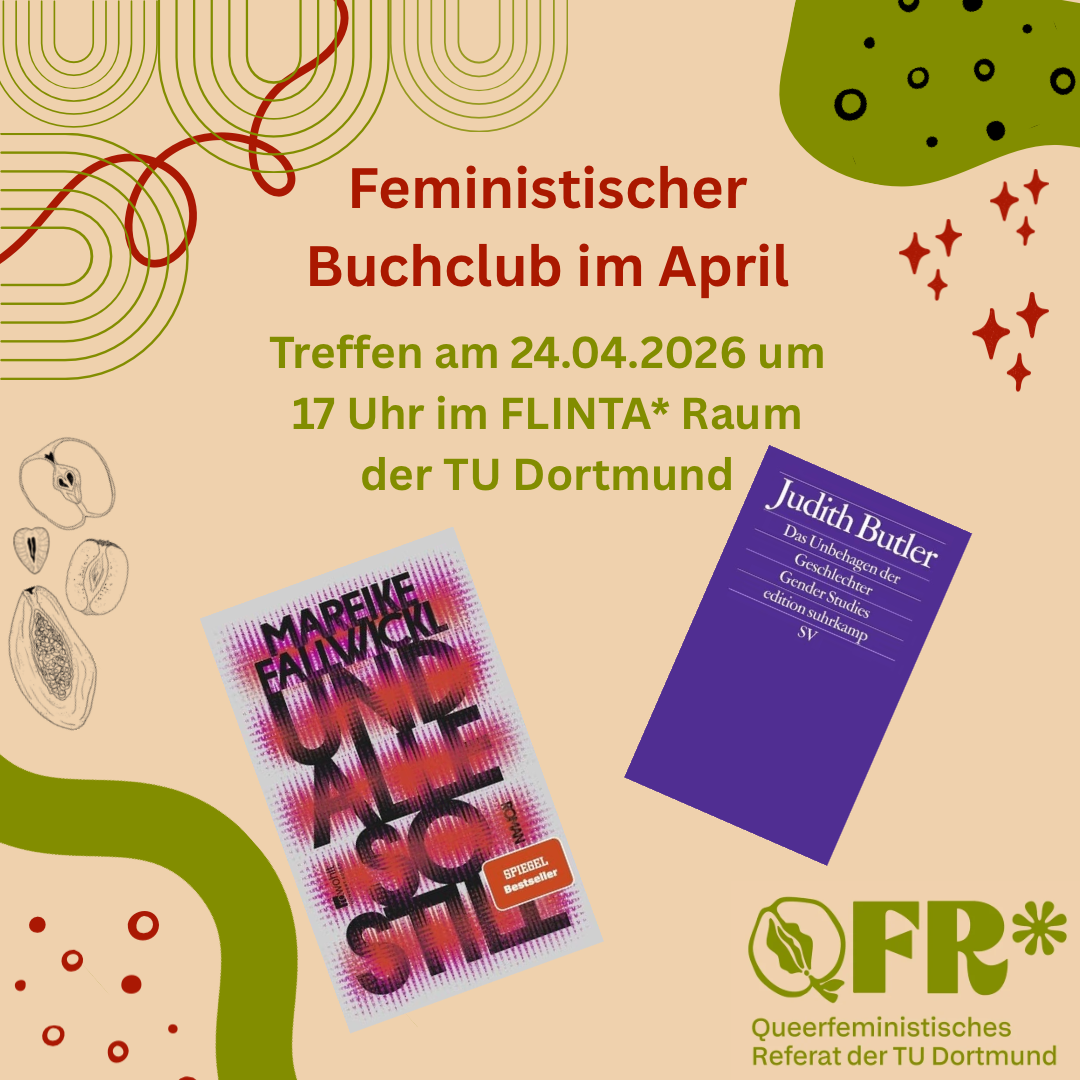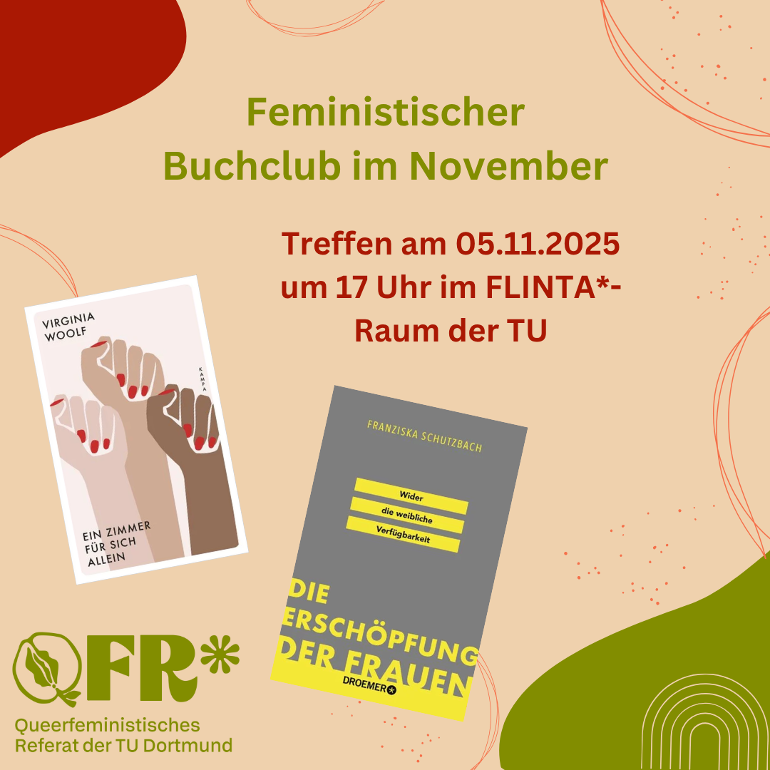Hallo ihr Lieben 😊 Pünktlich zum Start des Wintersemesters wollen wir euch zu unserem nächsten Buchclub-Treffen einladen: am 05.11.2025 kommen wir wieder ab 17 Uhr im FLINTA*-Raum der TU Dortmund zusammen (in der EF-50 im 0.504). Dabei besprechen wir die Bücher „Ein Zimmer für sich allein“ von Virginia Woolf und „Die Erschöpfung der Frauen“ von